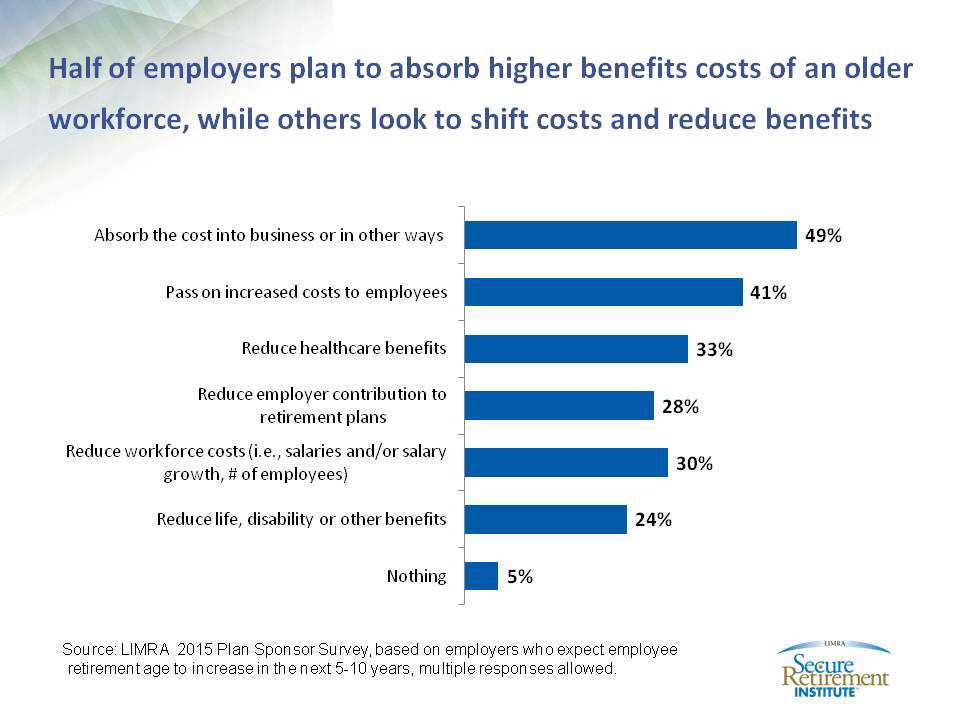 According to LIMRA Secure Retirement Institute, 73 percent of employers have planned for benefits costs to increase as a consequence of having older workers in their companies. Half have said they will absorb the costs while 41 percent will pass the costs on to employees. About a third of employers said they would consider reductions in benefits, salary growth and employer contributions to retirement plans to manage benefit costs. (See Chart)