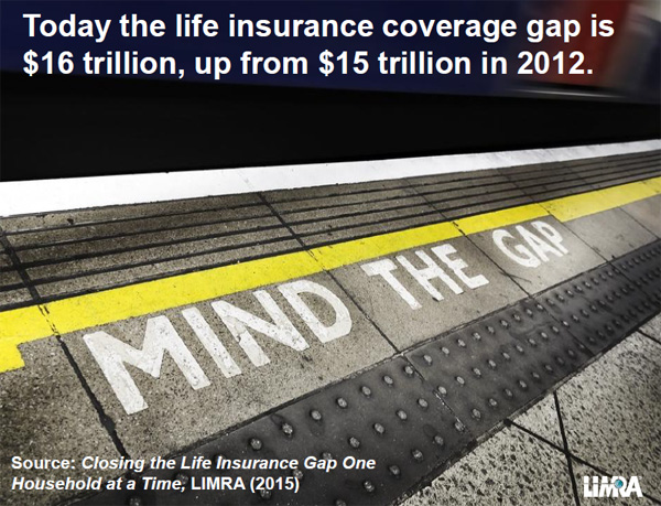 Just three years ago, the coverage gap — which LIMRA defines as total life insurance needs less existing life insurance — was $15 trillion. Now it’s a trillion dollars more than that. (LIMRA used numbers from the Federal Reserve Board’s Survey of Consumer Finances to do the math.)