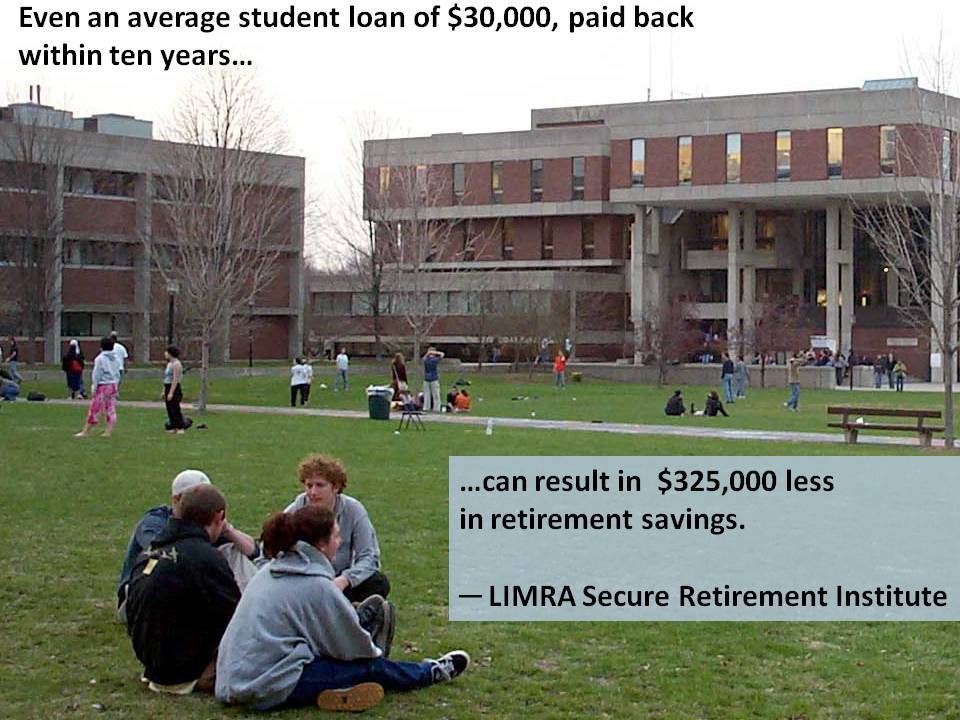 With the constant increase in education costs, student loans are growing in number and size. In 1990, the average student loan debt was around $10,000; by 2015, the average student loan debt is $33,000. Researchers at the Secure Retirement Institute found that a 22-year old who begins his or her career with $30,000 of student loan debt could reach retirement with $325,000 less than a peer who is not burdened with an education loan.