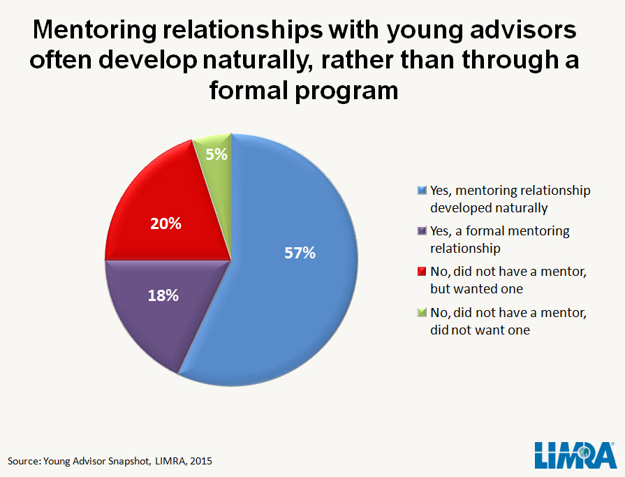 Among young advisors, 3 in 4 had a mentoring relationship. For the most part, their mentors were fellow advisors in the same firm. (Managers are more likely to serve as mentors in the affiliated insurance and independent channels.) Almost 60 percent of the time, the mentoring developed naturally without a formal program. (See chart.)