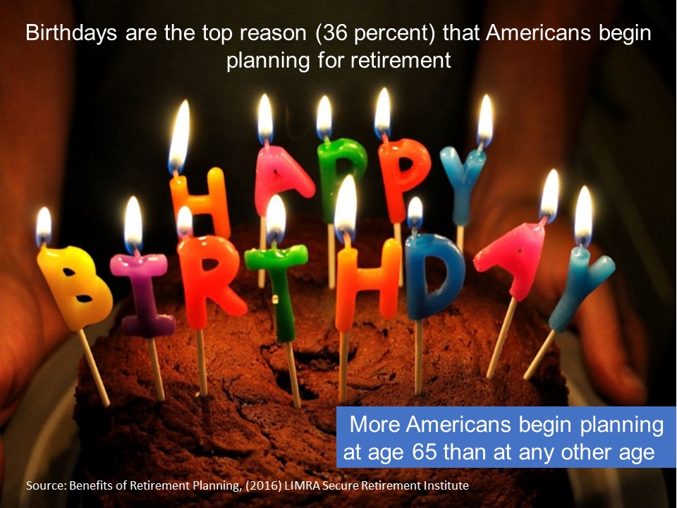 Birthdays are cause for celebration but they can also prompt people to examine their life situation. A recent LIMRA Secure Retirement Institute study found more Americans aged 55-75 with financial assets of $100,000 or more began planning for retirement when they reached a significant birthday (36 percent) than for any other single reason.