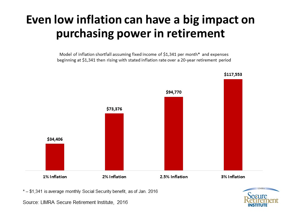 Even a low rate of inflation can significantly erode purchasing power in the long run. LIMRA Secure Retirement Institute modeled the effect 2 percent annual inflation could have on a 20-year retirement. Using a fixed monthly income of $1,341 (the average monthly benefit paid by Social Security) and assuming that monthly expenses increase from $1,341 to $1,993 at the end of the 20-year period, the inflationary impact results in a shortfall of $73,376. When the calculation is run at 3 percent inflation, the shortfall jumps to more than $117,000. (chart)