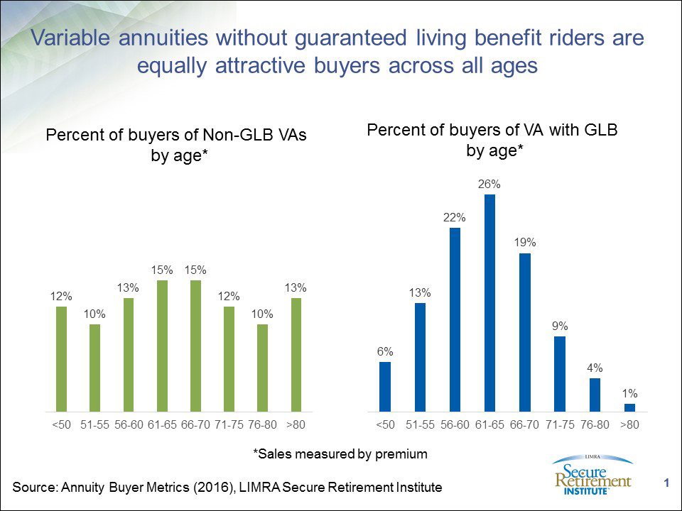 Recent LIMRA Secure Retirement Institute studies shows interesting differences in buyers of variable annuities with a guaranteed living benefit (GLB) rider than without the guaranteed living benefit. The average age of those who purchased a variable annuity contract without the guaranteed living benefit is five years younger than the average age of the buyers who choose to purchase the GLB rider (57.3 versus 62.5). Buyers of variable annuities with a guaranteed living benefit are more concentrated towards pre-retiree’s (chart).