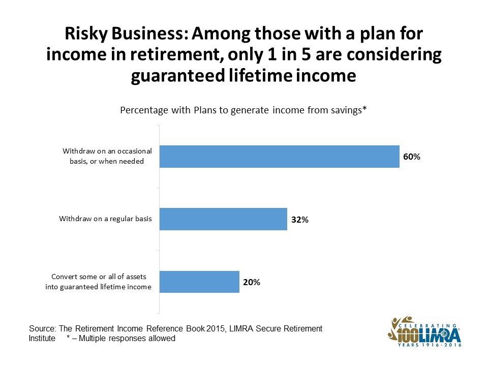 A LIMRA Secure Retirement Institute study of consumers between ages 45 and 75 with investable assets of $100,000 or more found that 56 percent do not have a strategy for income in retirement. Among those who do, their strategy consists largely of making withdrawals from their savings.