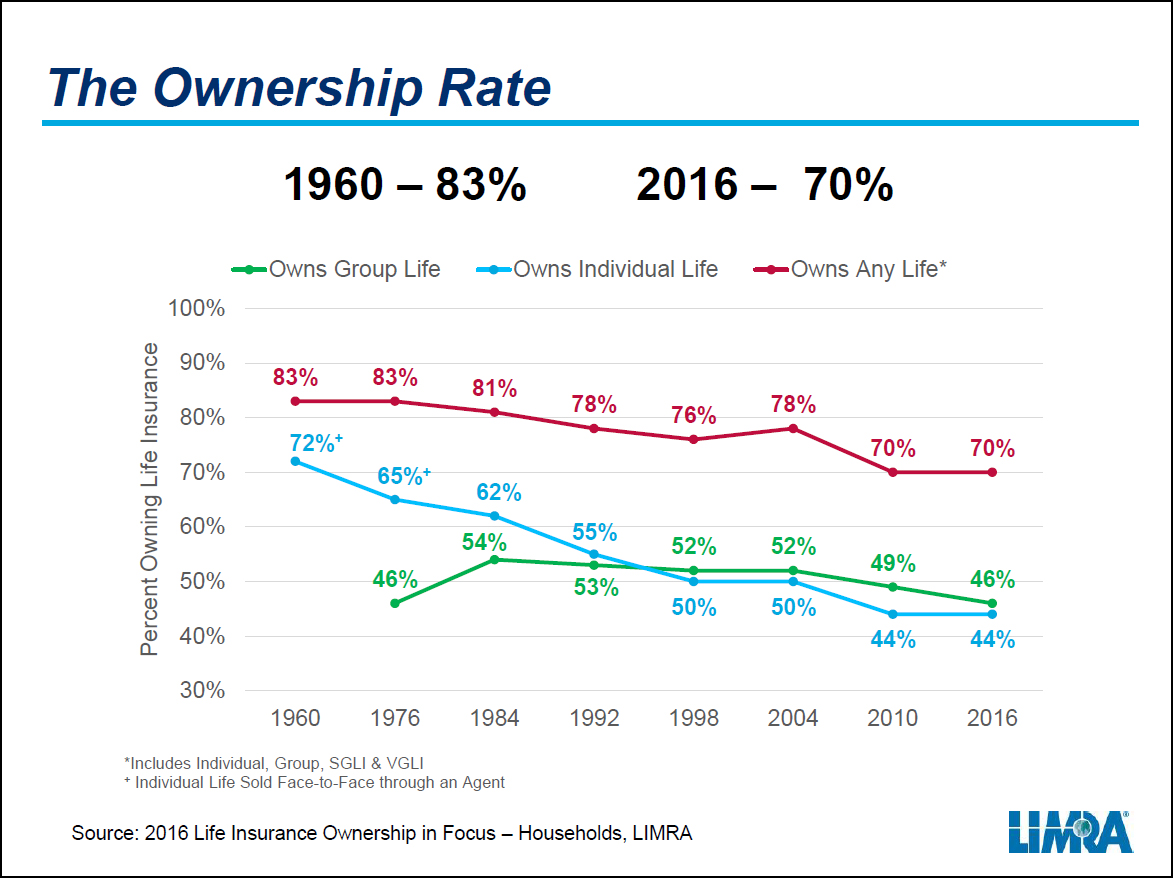 According to LIMRA’s 2016 Life Insurance Ownership Study, the US household ownership rate has dropped from 83 percent in 1960 to 70 percent in 2016. Even though the total number of households owning life insurance grew from 43.8 million to 87.2 million. This shows that the number of U.S. households owning life insurance isn’t growing as quickly as the total number of U.S. households.