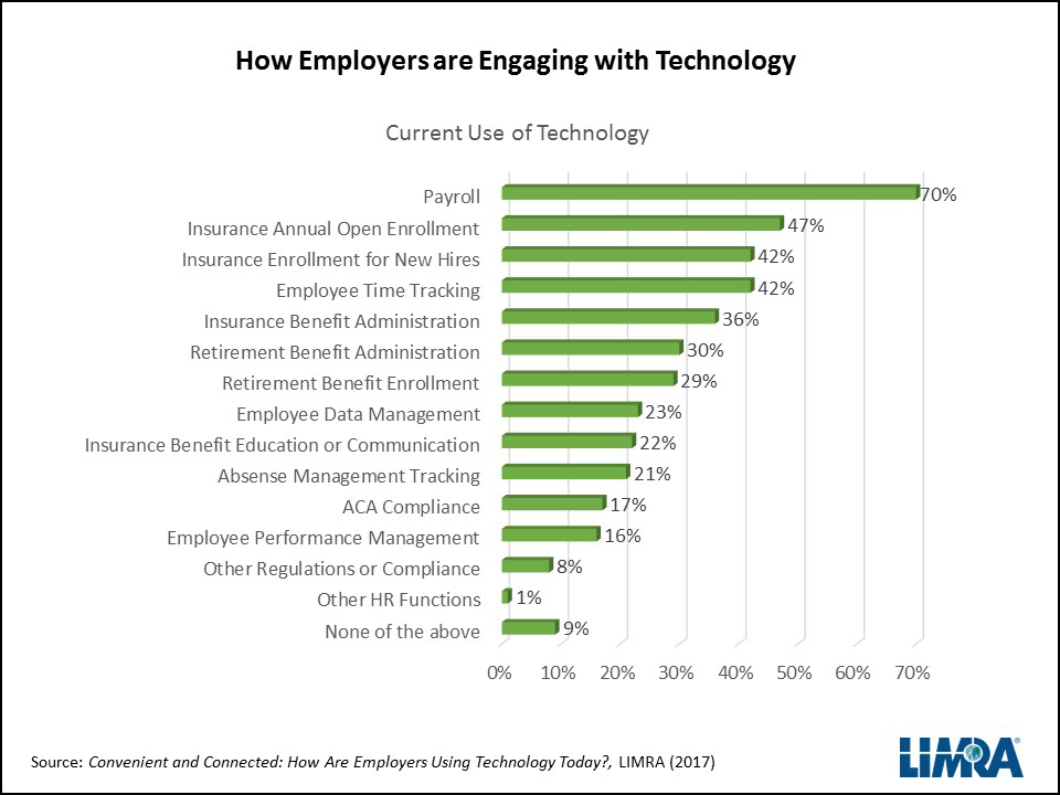 LIMRA research finds the most popular use of technology in the human resources function is payroll. Seven in ten companies have a technology platform that handles their payroll administration, which is the only type of technology that is prevalent even among small companies.