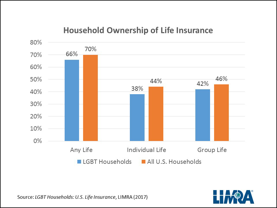 LIMRA research finds that about two-thirds of LGBT households own some type of life insurance, only slightly lower than the ownership rate of all U.S. households (66 percent versus 70 percent). Group and individual life insurance ownership were also just slightly lower than all U.S. households with 42 percent of LGBT households owning group life insurance (versus 46 percent) and 38 percent of LGBT households owning individual life insurance (versus 44 percent).