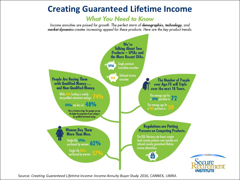 Demographics aside, there are regulatory changes that are also driving the growth of the income annuity market. Most recently, the Department of Labor fiduciary rule has put pressure on competing guaranteed lifetime income options such as guarantee lifetime benefits (GLBs), favoring the simple fixed-income product.