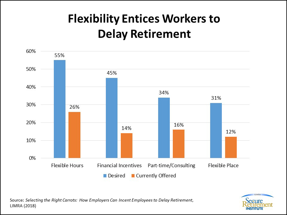 The study, Selecting the Right Carrots: How Employers Can Incent Employees to Delay Retirement, highlights flexible hours, part-time or consulting-based employment, flexible location and financial rewards top employees’ list of desired incentives to delay retirement. LIMRA SRI finds that on average, workers who receive all of their desired incentives say they would work an additional 14 years.
