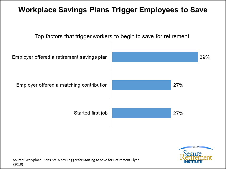 LIMRA research shows Americans’ top financial concern is affording a comfortable retirement. The first step is to systematically save throughout one’s career. Research shows access to a workplace savings plan is the most effective way to get people to start to save for retirement. Both employers and employees understand this.