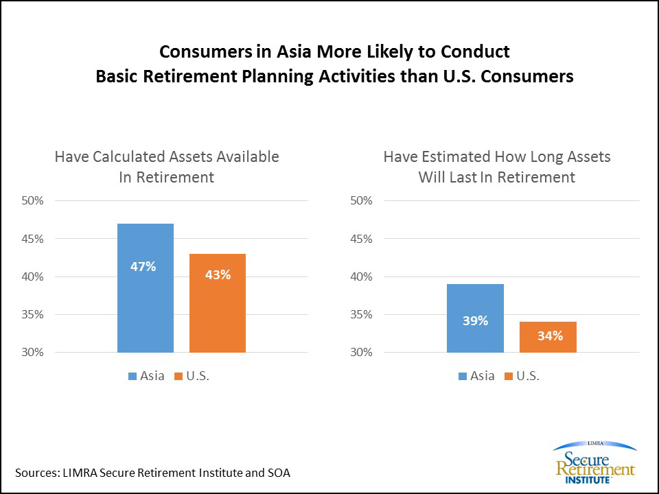According to the study, nearly half of consumers in Asia (47 percent) have calculated the assets they will have in retirement, and 39 percent have estimated how long those assets will last. In the U.S., 43 percent of consumers have calculated their assets in retirement, and only 34 percent have estimated how long their assets will last in retirement.