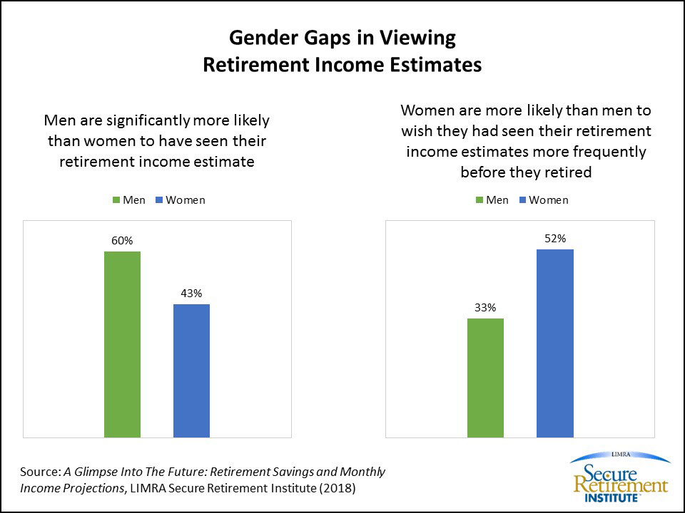 About half of workers (52 percent) say they have seen an estimate of their retirement income. LIMRA SRI research shows men are significantly more likely than women to have seen a retirement income estimate – 60 percent versus 43 percent. This gender gap also shows up after people retire. About 4 in 10 retirees wished they had seen more frequent estimates of how much monthly income their savings would generate in retirement before becoming retired. Women lead this group compared to men 52 percent to 33 percent.