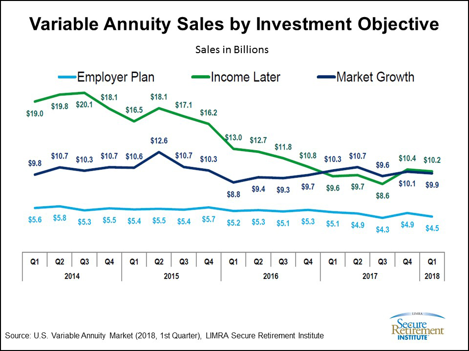 New LIMRA Secure Retirement Institute (LIMRA SRI) research, examining variable annuity (VA) sales by investment objective, finds VAs designed to provide ‘income later’ through guaranteed living benefit (GLB) riders have rebounded to reach $10.2 billion in the first quarter of 2018.