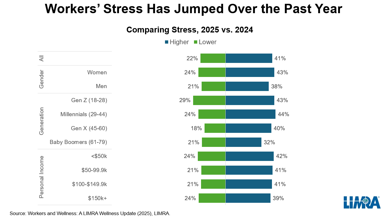 LIMRA’s Financial Index revealed the aggregate wellness score (on a scale of 1-10) dropped from 5.7 in 2022 to 4.9 in 2024. Women, younger workers, single/divorced individuals, and those with lower income or education levels were most vulnerable. However, stress is rising across all groups, as consumers face persistent inflation and greater economic uncertainty.