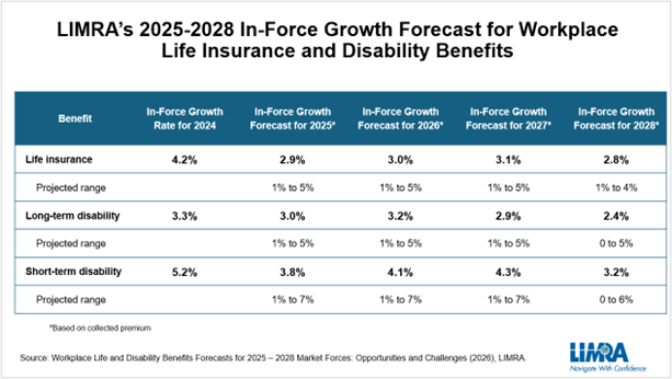 As the U.S. economy cools from the post-pandemic recovery and employment growth is projected to fall to under 1% from 2026 to 2028, LIMRA forecasts slower in‑force premium growth for life and disability products through 2028. Life insurance in‑force premium growth is expected to fall below historical averages, while long‑term and short‑term disability premiums should remain closer to recent norms.