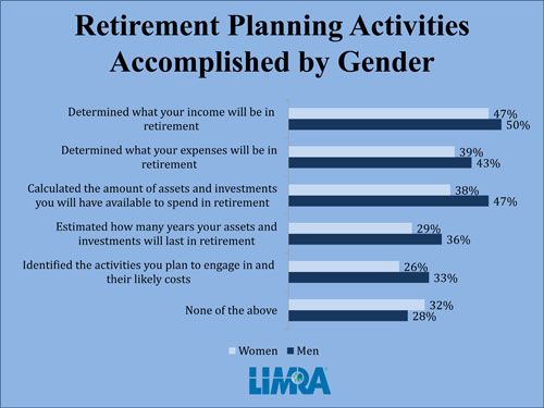 WINDSOR, Conn., Oct. 22, 2012-Despite being more concerned about the potential risks they face in retirement than men, a new study by LIMRA found that fewer women had completed any of the basic retirement planning activities (determining expenses and income, calculating assets, etc.). Thirty-two percent of women said they had done no retirement planning. (See chart below or the PDF here)