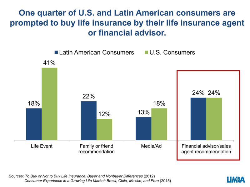 The Latin American report, Consumer Experience in a Growing Life Market: Brazil, Chile, Mexico and Peru, also reveals that family and friend recommendations are the top reasons why people shop for life insurance. But the most compelling prompts to buy a policy came from financial representatives at 24 percent.