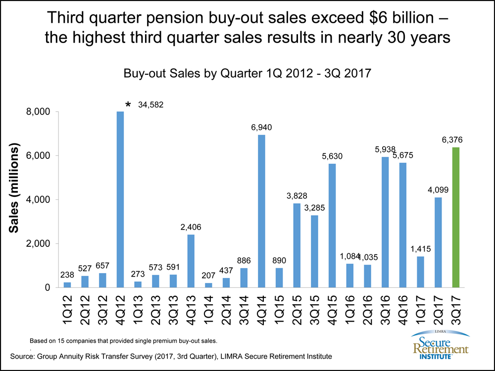 WINDSOR, Conn., Nov. 16, 2017—U.S. single premium pension buy-out product sales were $6.4 billion in the third quarter of 2017, a 7 percent increase compared with prior year. This is the tenth consecutive quarter of sales over $1 billion, according to LIMRA Secure Retirement Institute’s quarterly U.S. Group Annuity Risk Transfer Survey.