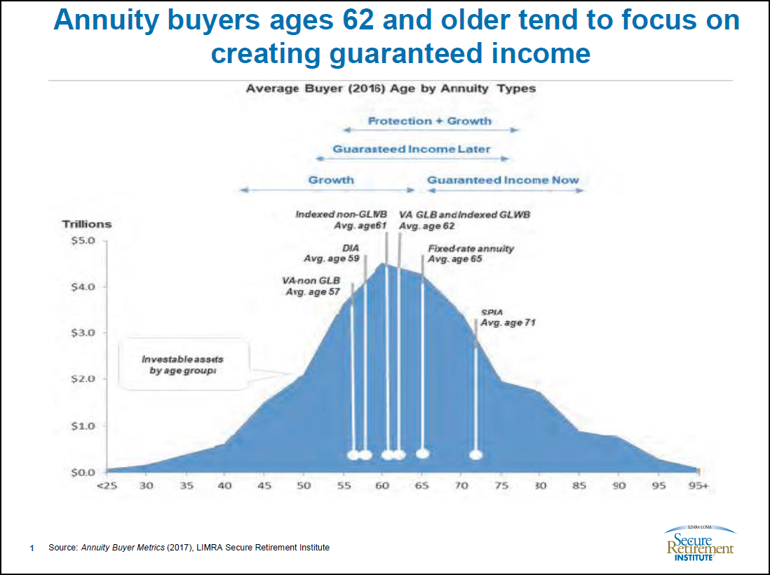 The study also examines the age of the buyers and what they purchased. Those who bought annuities designed for accumulation tend to be under 61, a time when most Americans are still in the accumulation phase. The study found buyers over age 62 tend to purchase annuities designed to create guaranteed income (chart).