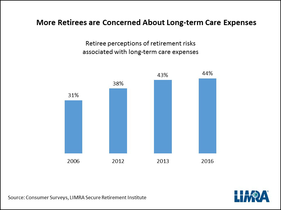 According to LIMRA data, there will be about 82 million retired Americans by 2040. The U.S. government estimates more than half of those 65 and older will need long-term care (LTC) during their lifetime. Retirees are growing more aware of the risks associated with LTC costs. According to LIMRA Secure Retirement Institute research, 44 percent of retirees are concerned about LTC expenses, more than 40 percent higher than in 2006. (Chart 2)