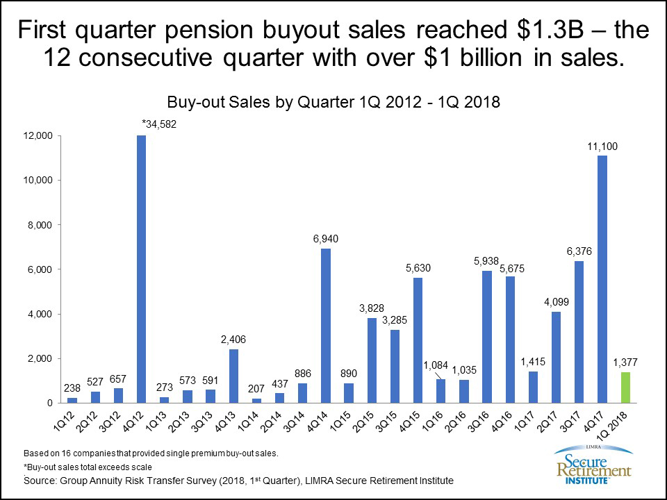 WINDSOR, Conn., May 23, 2018 – U.S. single premium pension buy-out product sales exceeded $1.3 billion in the first quarter 2018, dropping 3 percent from first quarter 2017. This is the 12th consecutive quarter of sales over $1 billion, according to the LIMRA Secure Retirement Institute (LIMRA SRI) quarterly U.S. Group Annuity Risk Transfer Survey.