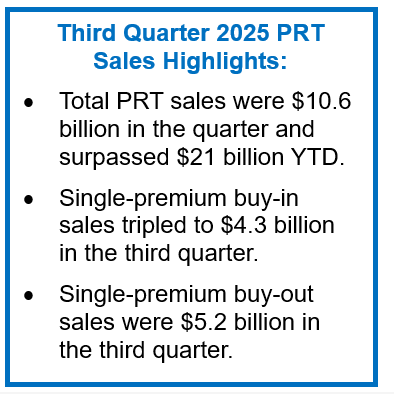 Although third quarter 2025 PRT sales fell 32% year over year, results were 137% higher than second quarter 2025 results. In the third quarter, total PRT new premium was $10.6 billion. YTD, total PRT sales were $21.6 billion, down 48% year over year.