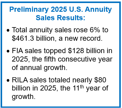WINDSOR, Conn., Feb. 12, 2026—Total U.S. annuity sales increased 6% to $461.3 billion in the 2025, according to preliminary results from LIMRA’s U.S. Individual Annuity Sales Survey, which represents 92% of the total U.S. annuity market.